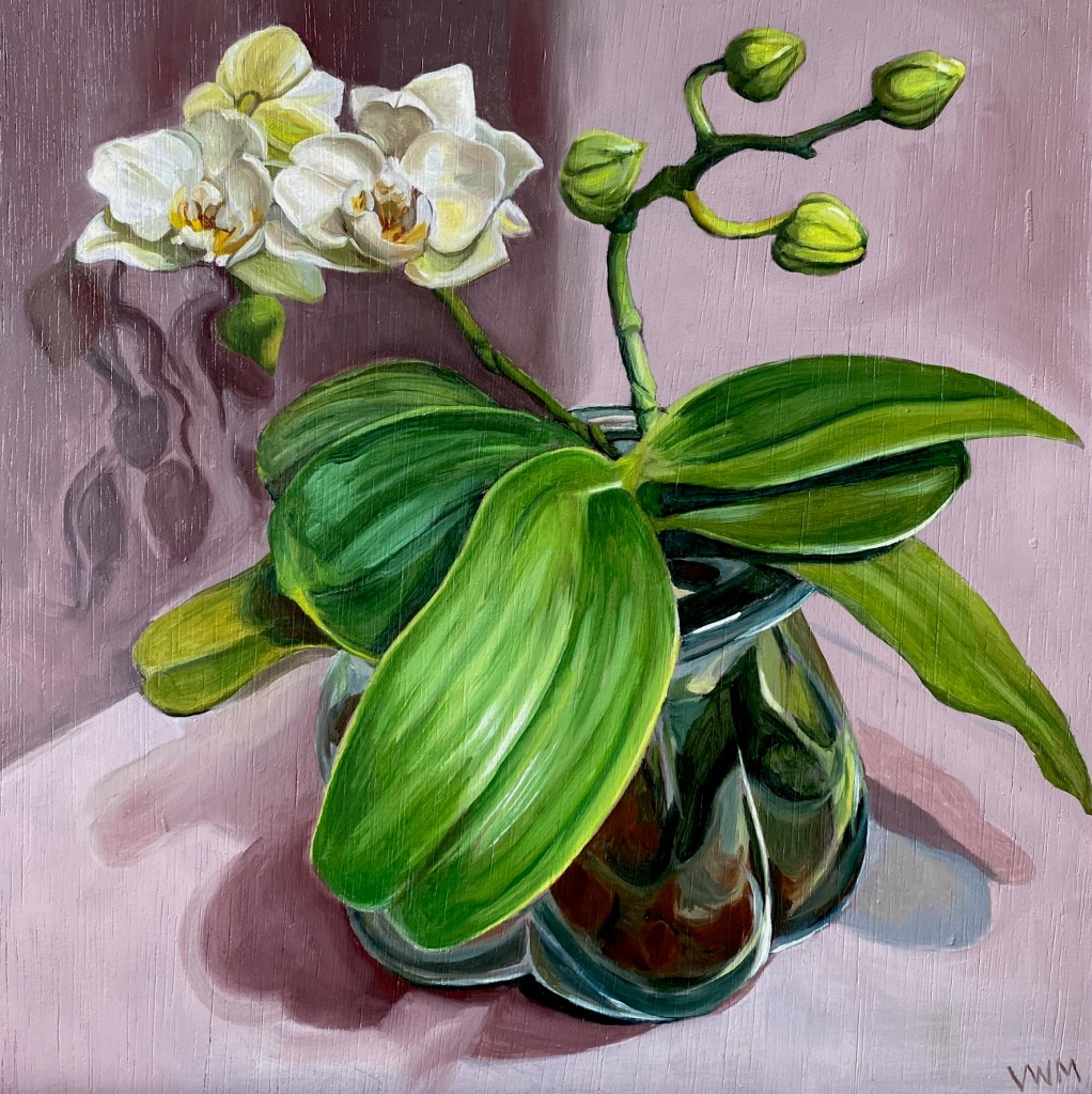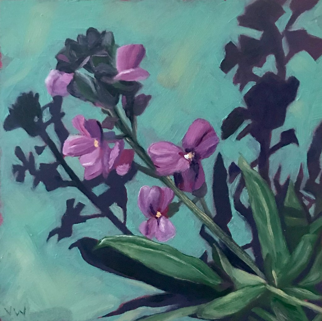 Flingo, oil on paper. 2023. Prints available.Seymore, oil on board. 2025. Just because you can…, graphite and coloured pencil on paper. 2025.The red shoes. Oil on paper. 2024. Money plant in glass jar. Oil on board. 2023.Wallflowers, watersoluble oil on board. 2022.